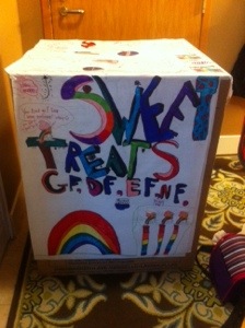 How I started my business May 14, 2014Sara Donnelly 2 Comments First I duck taped a box to my skate board and I would have my 🍩🍪🍰 in it.Then I got a big tall dish washer box (empty) I made a sign that said SWEET TREATS I even make sweet treats for dogs.